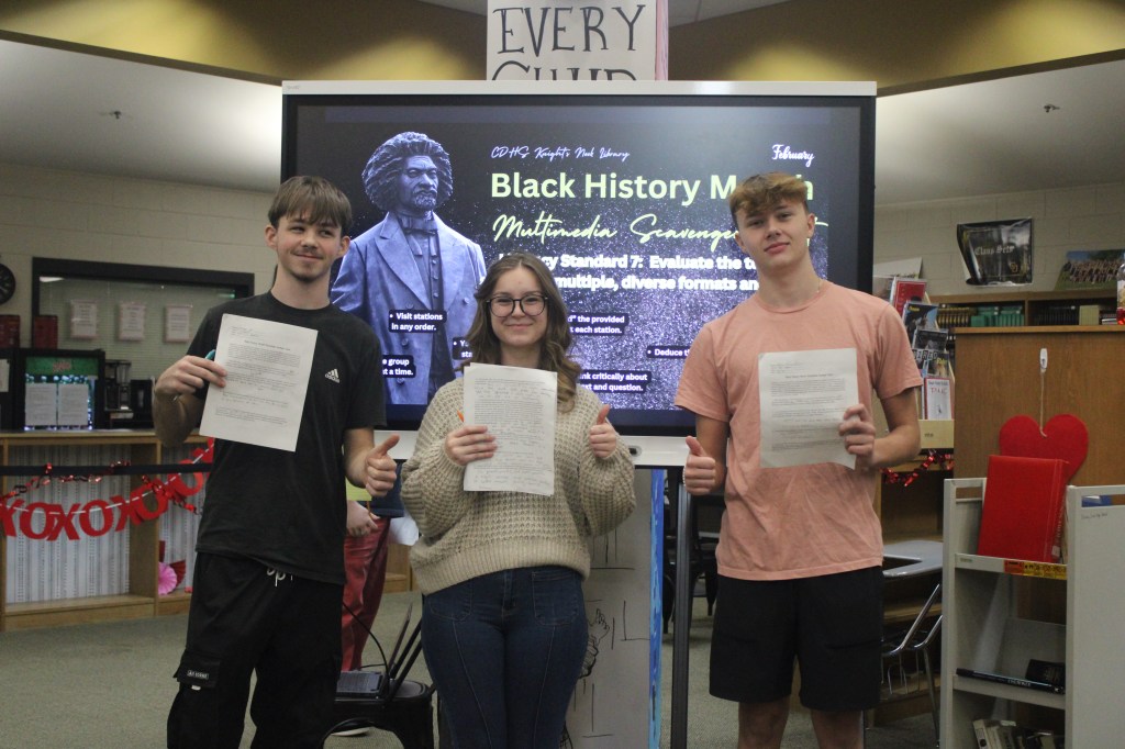 During the last week in January, The Knight’s Nook Library hosted groups from Mrs. Wagner’s classes coming to complete a literacy task about Black History Month. Black History Month, which is actually in February (this month), is a period dedicated to celebrating and recognizing the achievements and contributions of African Americans to the United States throughout history. Chuckey-Doak High School is a school with kids from different ethnic backgrounds, and it is important for us to learn about Black History Month, so no child or individual feels left out at school and because African Americans have impacted United States’ history in such an impactful way. This week’s library tasks are important, but they are also a hands-on experience so that students feel more involved while having fun. Ms. Pollock, our school librarian, designed this multimedia scavenger hunt to help students practice literacy standard 7 (analyzing works produced in different media formats) while learning about their history standards, focusing on Black History.